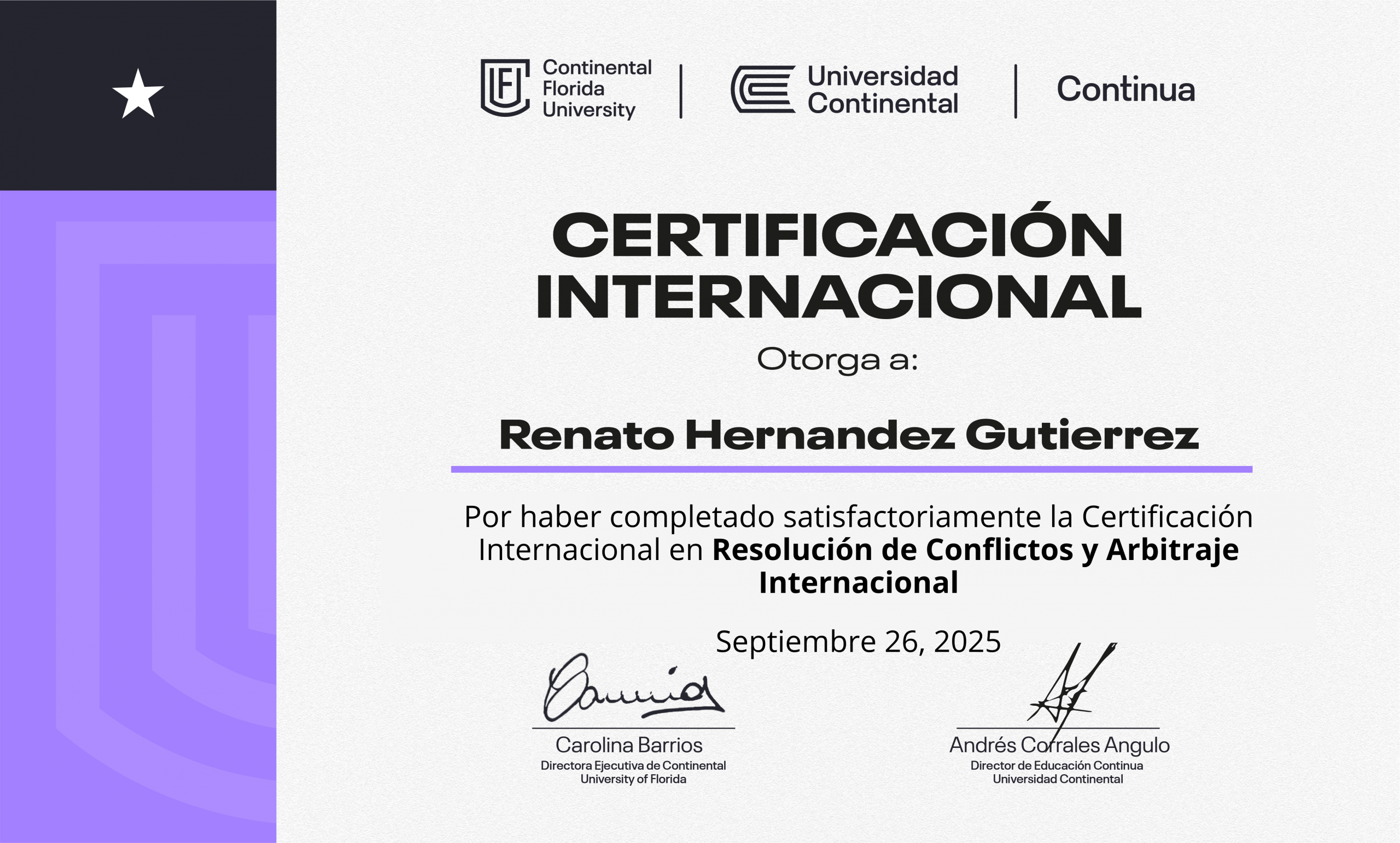 - Certificación Nacional (Centro de Educación Continua de la Universidad Continental – Perú)